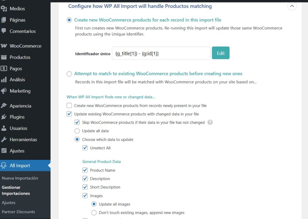 1. Dentro de los ajustes de la importación (Manage Imports > Settings), busca la sección: “When WP All Import finds new or changed data”.