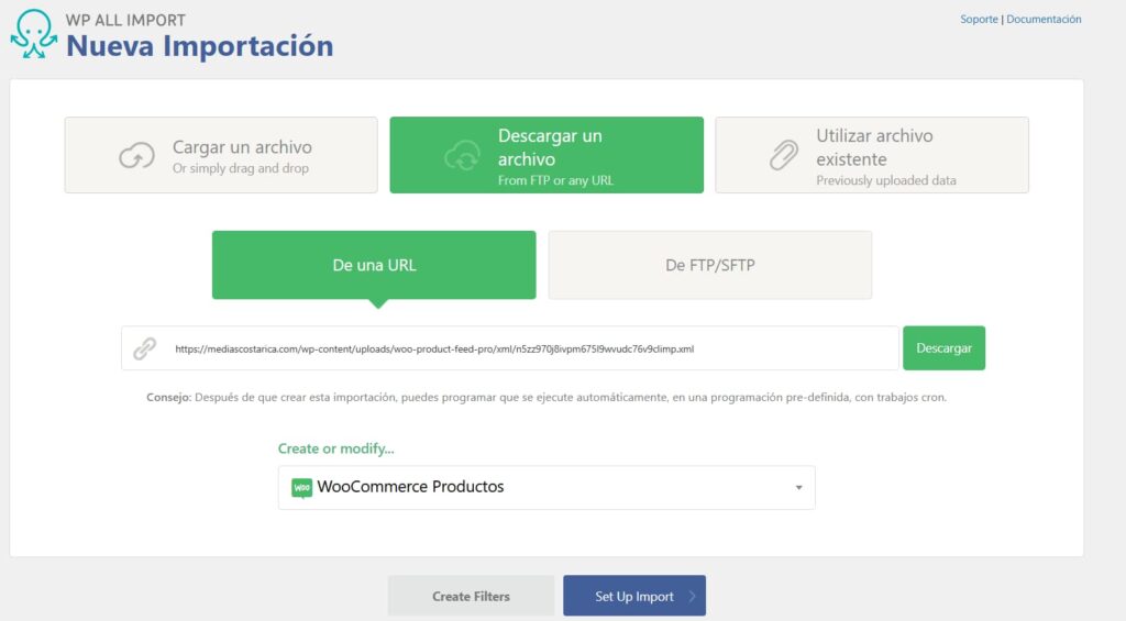 Ahora configuraremos el sitio de destino para que lea ese archivo XML e importe los productos como propios.