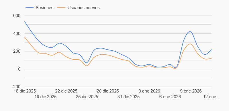 • Dato valioso: Si los “Usuarios nuevos” siempre están muy por debajo de las “Sesiones”, significa que tienes buena fidelidad, pero te falta gasolina nueva (prospectos) para crecer.