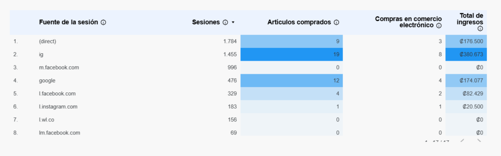 El dato valioso: Puede que Instagram te traiga muchísimas visitas, pero si su ticket promedio es de ₡5,000 y el de Google es de ₡15,000, ya sabes dónde está el cliente que realmente hace crecer tu negocio.