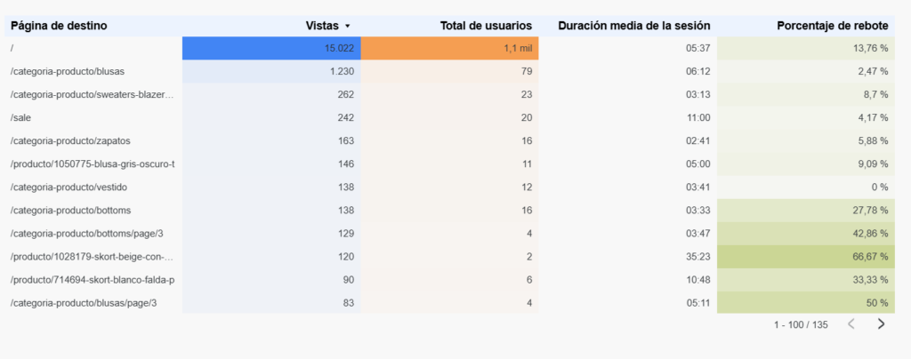 “Usa esta página para identificar tus ‘páginas estrella’ y replicar ese éxito en las demás. Si una página tiene muchas vistas pero un rebote alto, estás perdiendo clientes en la puerta de tu negocio”.
