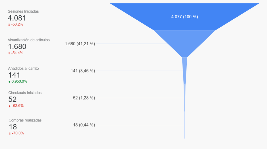 • Ejemplo: Si tienes 235 sesiones pero solo 7 añadidos al carrito, tu problema está en las fotos o precios de los productos.