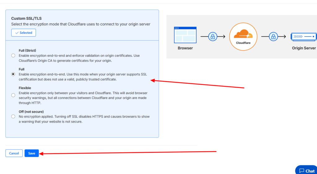 - Cambia a modo “Full”: Verás varias opciones (Flexible, Full, Strict). Selecciona Full (Completo). Esto le dice a Cloudflare que use cifrado incluso si el certificado de tu hosting no es perfecto.